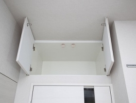 部屋の上部にアッパーキャビネットを設けています。日常的に使わない用品などすっきり整頓できます。