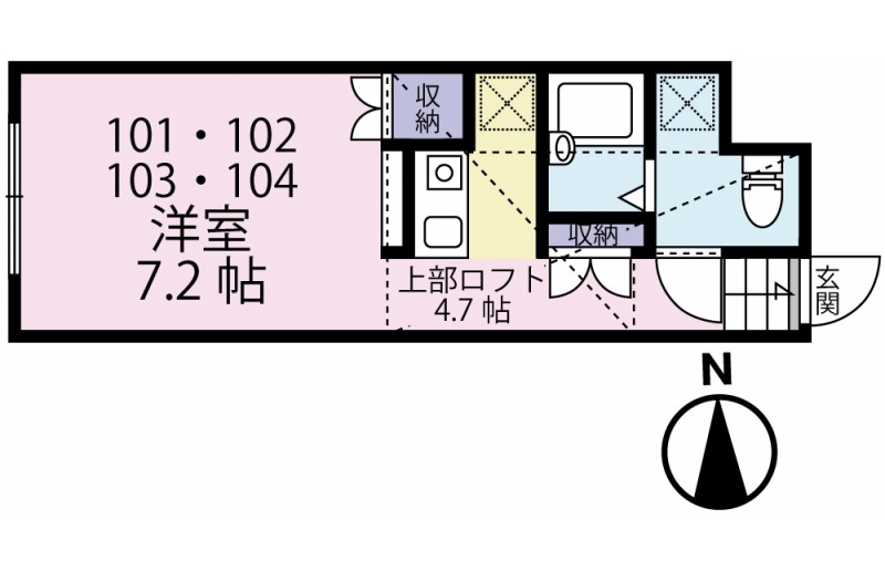 | 設備・条件 | TVドアホン、駐輪場、バス・トイレ別、温水洗浄便座、室内洗濯機置き場、ロフト付き、エアコン、敷金なし、ペット不可 | ||