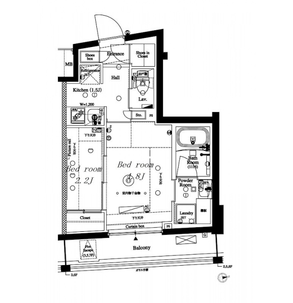 洋室 2.2 畳 洋室 4.8 畳 K 1.5 畳 |