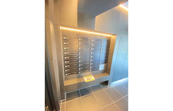 【宅配ボックス】不在時に届いた宅配便を本人の代わりに受け取り、24時間いつでも取り出せる宅配ボックス。2つの住宅設備を一体化させ、美しいデザインを実現させました。非接触キー対応なので、帰宅時に手荷物がある時も便利に利用できます。