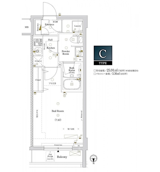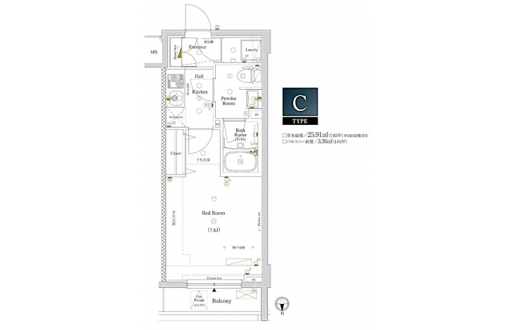 | 専有面積 | 25.91m² | バルコニー面積 | 3.36m² |
