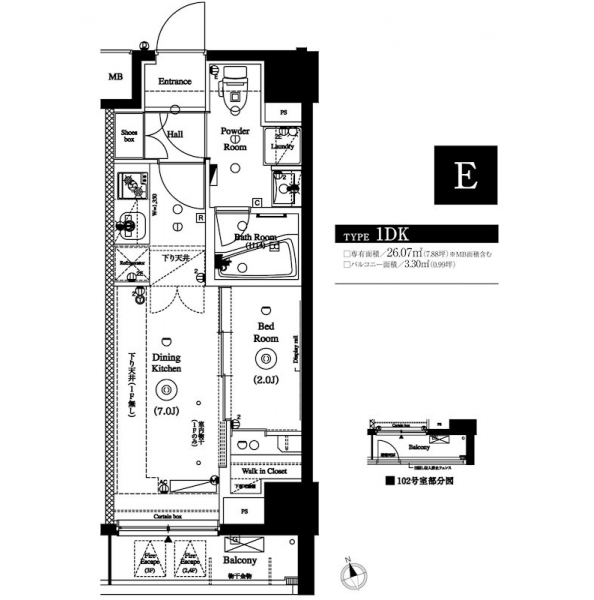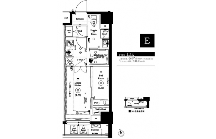 | 専有面積 | 26.07m² | バルコニー面積 | 3.30m² |