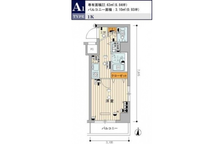 | 専有面積 | 22.63m² | バルコニー面積 | |