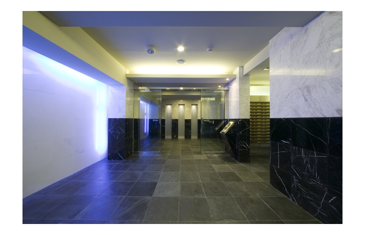 【エントランスロビー】内外部の壁面には色合いや質感に優れた高級感あふれる面材をふんだんに使用、プライベートエリアへのプロローグを上品に、そしてドラマティックに演出します。