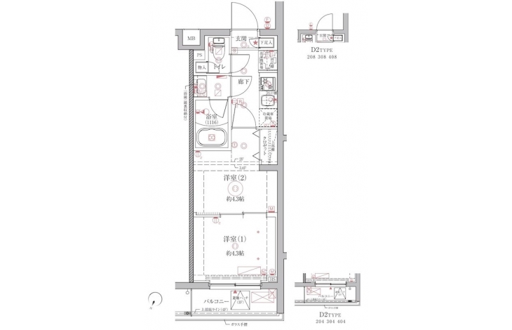 洋室 4.3 畳 洋室 4.3 畳 K 2 畳 |