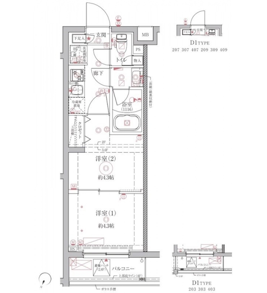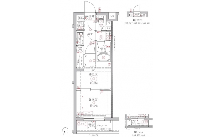 洋室 4.3 畳 洋室 4.3 畳 K 2 畳 |