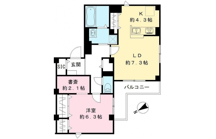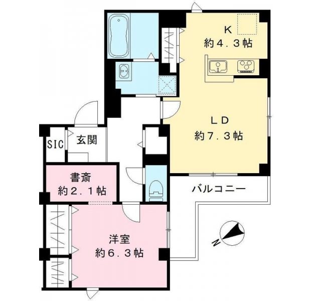 LD 7.3 畳 K 4.3 畳 洋室 6.3 畳 S 2.1 畳 |