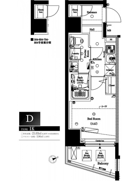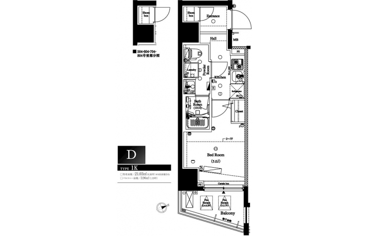 | 専有面積 | 21.03m² | バルコニー面積 | 3.96m² |