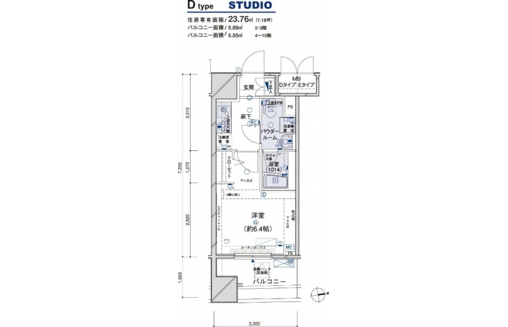 | 専有面積 | 23.76m² | バルコニー面積 | 5.89m² |