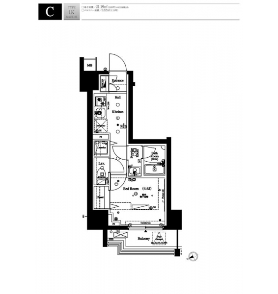 | 専有面積 | 21.19m² | バルコニー面積 | 3.82m² |