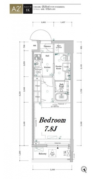 | 専有面積 | 25.51m² | バルコニー面積 | 3.72m² |