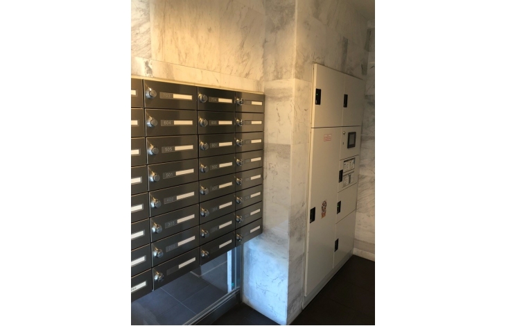 【メールボックス&宅配ボックス】個人の郵便物を受け取るためのメールボックス。不在時に届いた宅配便を本人の代わりに受け取り、24時間いつでも取り出せる宅配ボックス。2つの住宅設備を一体化させ、美しいデザインを実現させました。非接触キー対応なので、帰宅時に手荷物がある時も便利に利用できます。