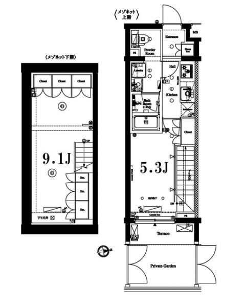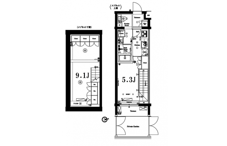 K 2 畳 洋室 9.1 畳 洋室 5.3 畳 |