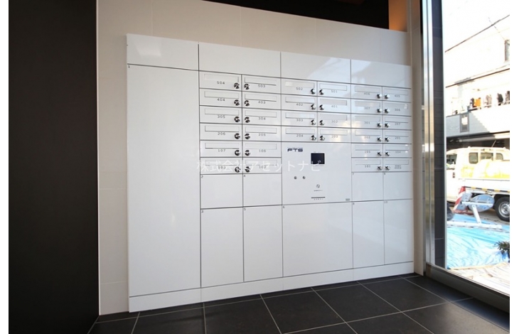 【メールボックス&宅配ボックス】個人の郵便物を受け取るためのメールボックス。不在時に届いた宅配便を本人の代わりに受け取り、24時間いつでも取り出せる宅配ボックス。2つの住宅設備を一体化させ、美しいデザインを実現させました。非接触キー対応なので、帰宅時に手荷物がある時も便利に利用できます。