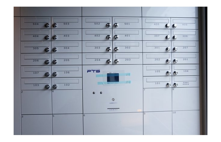 【メールボックス&宅配ボックス】個人の郵便物を受け取るためのメールボックス。不在時に届いた宅配便を本人の代わりに受け取り、24時間いつでも取り出せる宅配ボックス。2つの住宅設備を一体化させ、美しいデザインを実現させました。非接触キー対応なので、帰宅時に手荷物がある時も便利に利用できます。