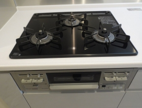 火力の強弱を使い分けできる3口ガスコンロを採用(2kタイプのみ 1kタイプはコンロ2口) 下部にはグリル付きです。