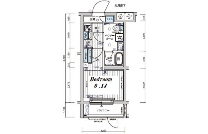 K 2 畳 洋室 6.1 畳 |