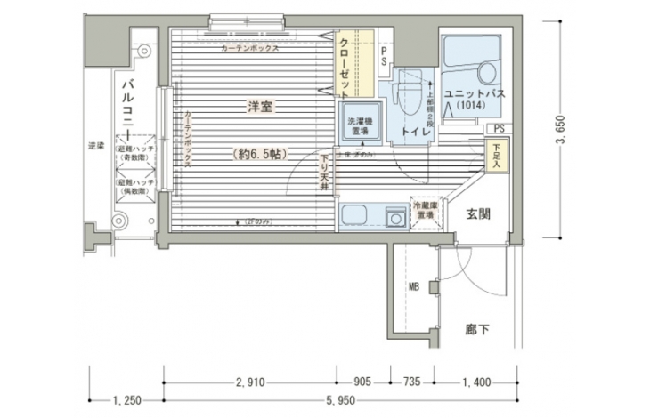 K 2 畳 洋室 6.5 畳 |