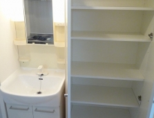 便利な洗面台横収納。タオル・小物等を整理しやすく配慮しました。