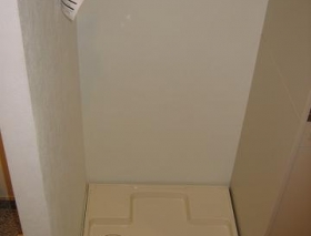 防水パンを設置。重い洗濯機を動かさずに排水管をスムーズに掃除できるよう、床からある程度の高さをつけています。
