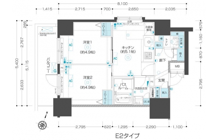 K 5.1 畳 洋室 4.9 畳 洋室 4.9 畳 |