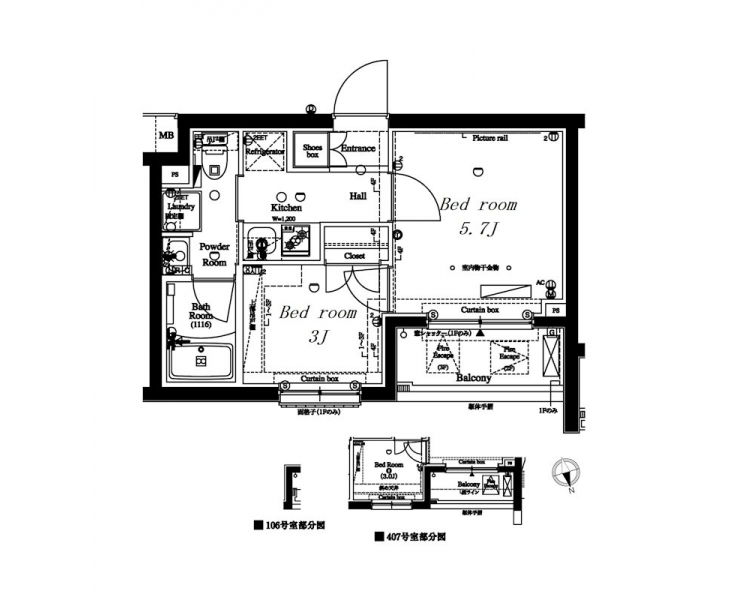 洋室 3 畳 洋室 5.7 畳 K 2 畳 |