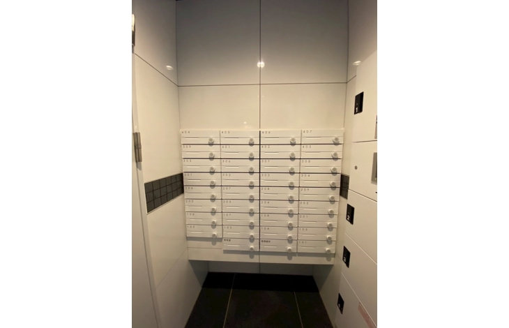 【宅配ボックス&メールボックス】個人の郵便物を受け取るためのメールボックス。不在時に届いた宅配便を本人の代わりに受け取り、24時間いつでも取り出せる宅配ボックス。2つの住宅設備を一体化させ、美しいデザインを実現させました。