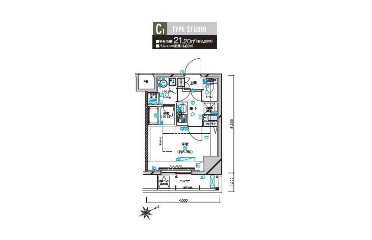 | 専有面積 | 21.20m² | バルコニー面積 | |