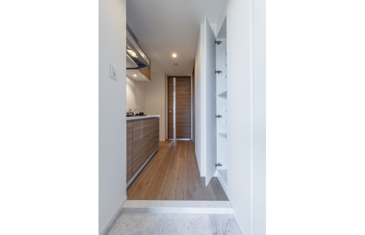 【ロビー】内外部の壁面には色合いや質感に優れた高級感あふれる画材をふんだんに使用、プライベートエリアへのプロローグを上品に、そしてドラマティックに演出します。